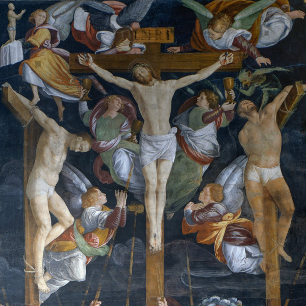 Uno dei malfattori appesi alla croce lo insultava: «Non sei tu il Cristo? Salva te stesso e noi!». L’altro invece lo rimproverava dicendo: «Non hai alcun timore di Dio, tu che sei condannato alla stessa pena? Noi, giustamente, perché riceviamo quello che abbiamo meritato per le nostre azioni; egli invece non ha fatto nulla di male». E disse: «Gesù, ricòrdati di me quando entrerai nel tuo regno». Gli rispose: «In verità io ti dico: oggi con me sarai nel paradiso».